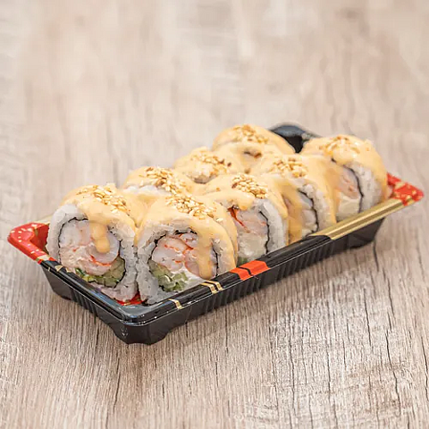 Состав: Рис заправленный, сыр творожный, креветка отварная, соус манго чили, майонез, кунжут.