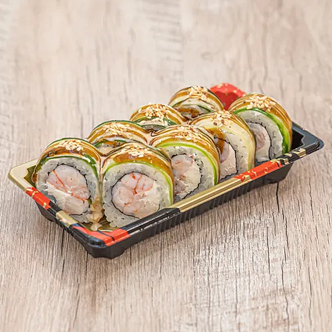 Состав: Рис заправленный, сыр творожный, форель слабосолена, огурец, соус унаги, соус терияки.