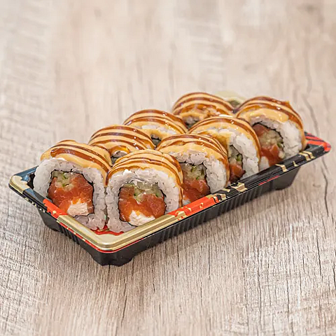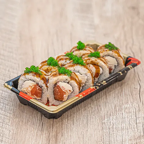 Состав: Рис заправленный, сыр творожный, форель слабосолена, огурец, соус унаги, соус терияки.