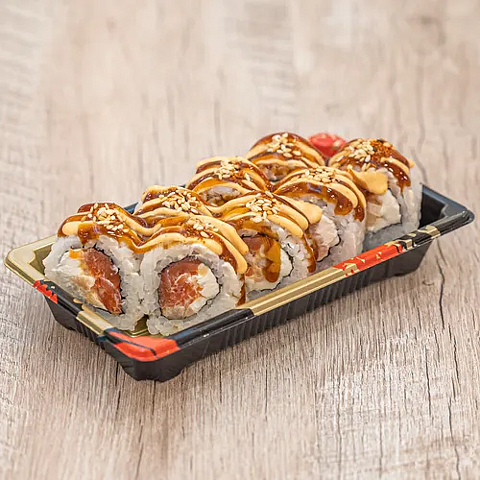 Состав: Рис заправленный, водоросли нори, сыр творожный, масляная рыба, форель с/с, соус хотто, соус унаги, кунжут.