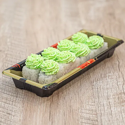 Состав: Рис заправленный, сыр творожный, огурец свежий, лосось с/с, соус лава (Сыр творожный, майонез, икра тобико зеленая)
