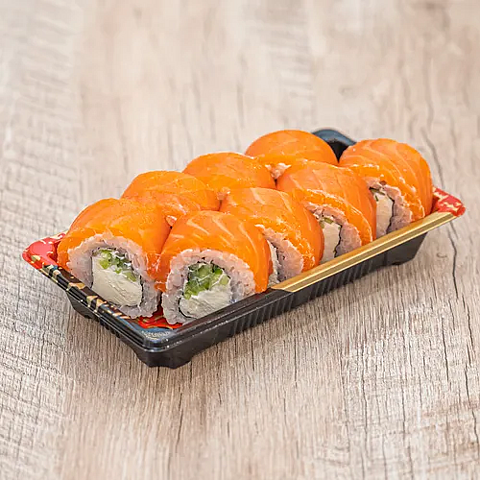 Состав: Рис заправленный, лосось слабосоленый, сыр творожный, соус терияки, огурец свежий.